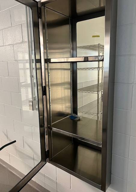 The cabinet features a secure locking mechanism to protect contents, along with a smooth-opening hinged door for convenient access. Its modern, polished finish not only ensures easy cleaning and sanitation but also adds a professional, streamlined look to any setting.